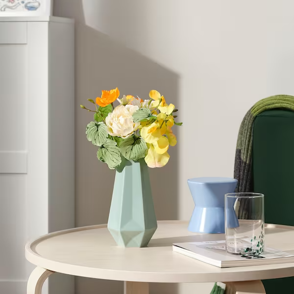 Enjoy the vibrant and long-lasting beauty of the IKEA SMYCKA artificial bouquet. Made mostly from recycled plastic, this bouquet features a lovely mix of flowers, making it perfect for any indoor or outdoor setting. Add a touch of elegance to your shelf or dining table with this decorative piece.
