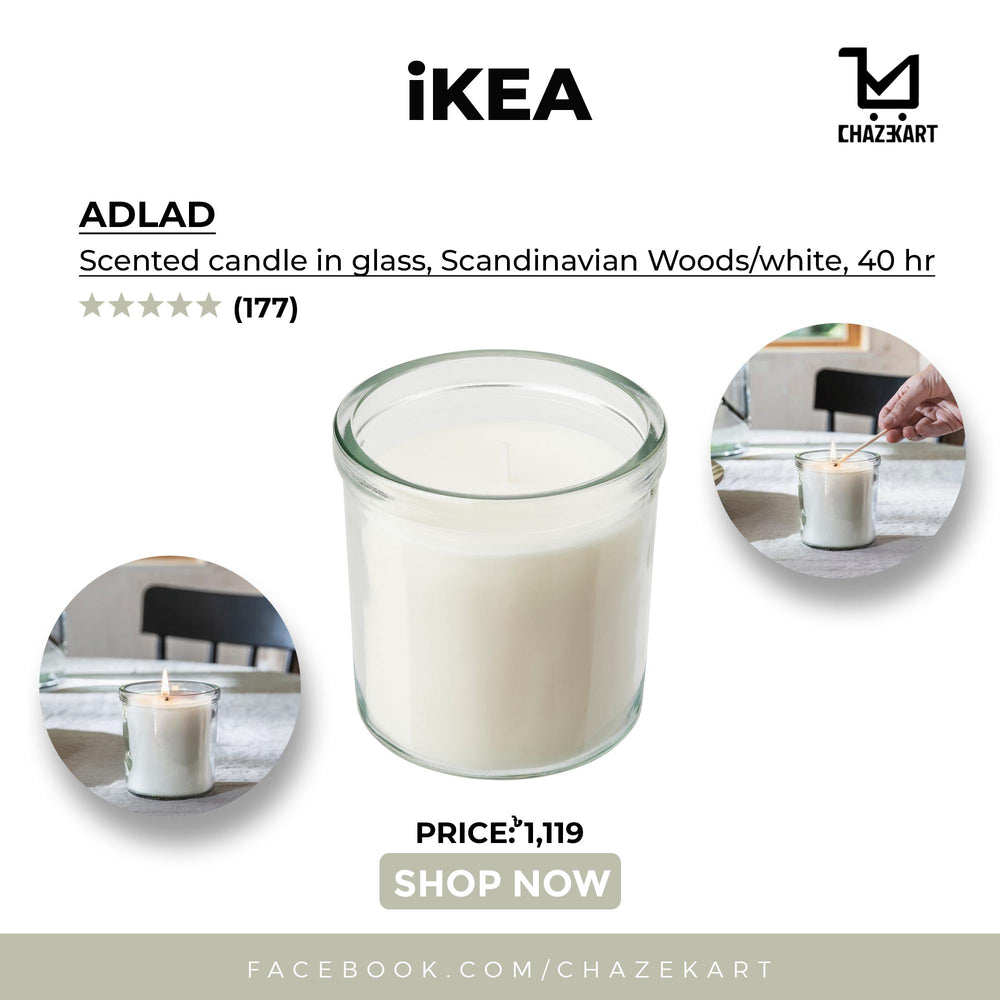 IKEA ADLAD Scented candle in glass, Scandinavian Woods/white, 40 hr is backordered and will ship as soon as it is back in stock.