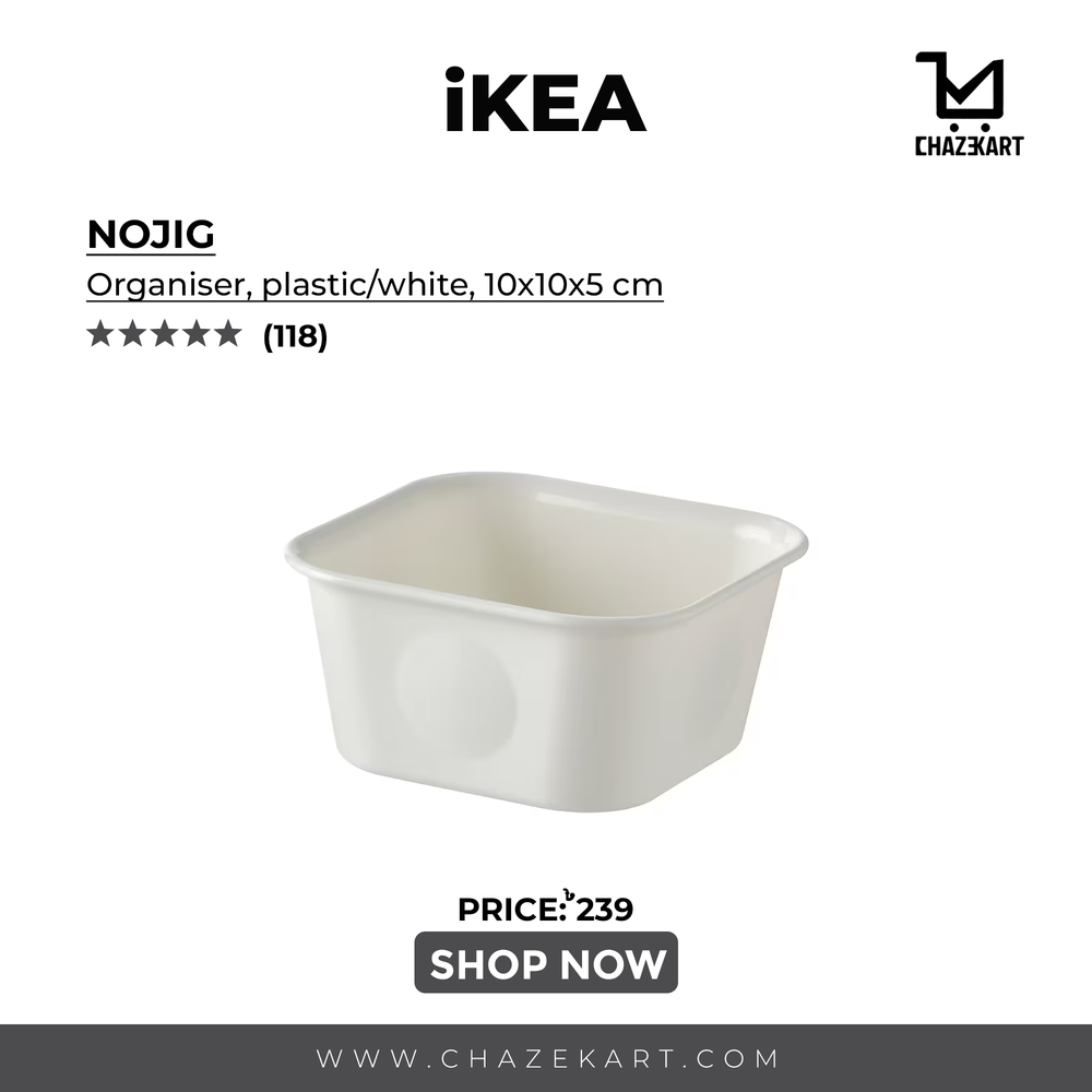 IKEA NOJIG Organiser, plastic/white, 10x10x5 cm (4x4x2 ") is backordered and will ship as soon as it is back in stock.