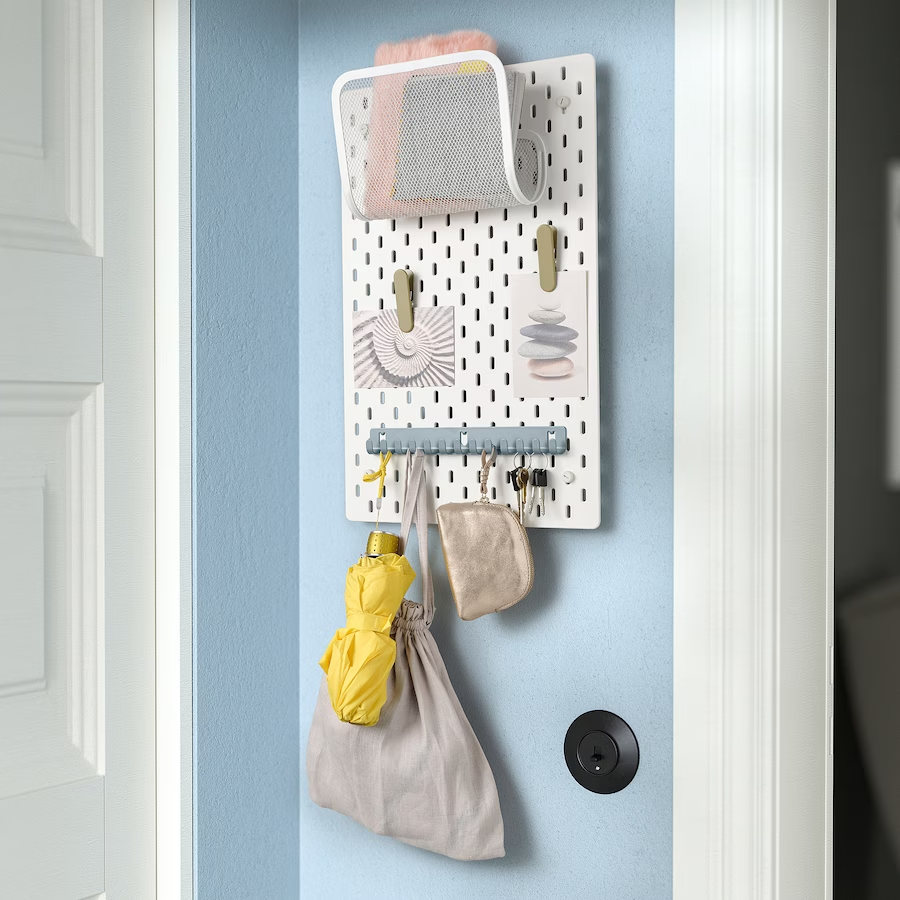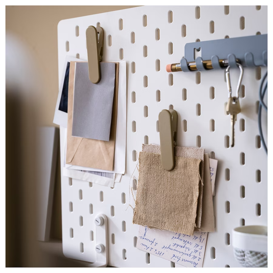 The SKADIS Clip is a beige-green tool designed to help you optimize your organization while giving you easy access to your items with the SKÅDIS pegboard. The Clip helps you customize your storage needs and keep your essential items close at hand.