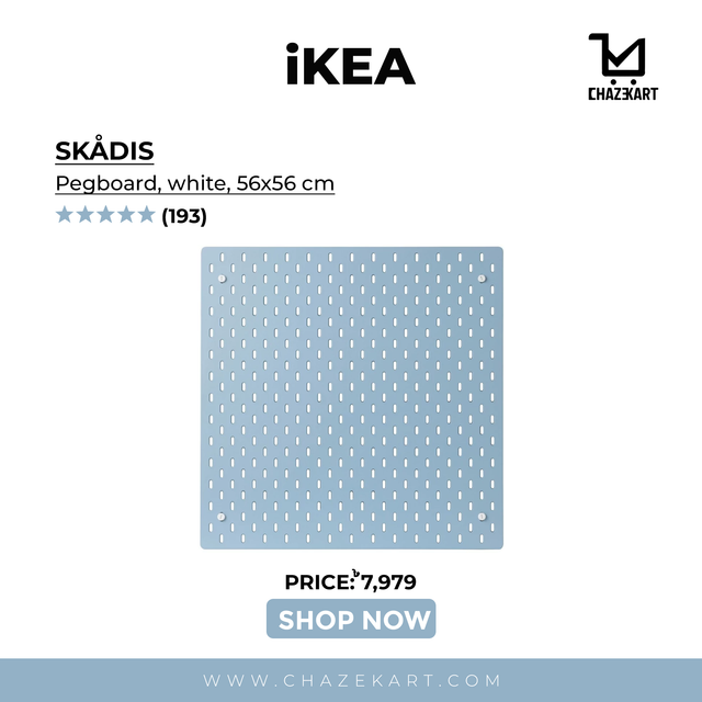 The SKADIS Pegboard is perfect for optimizing indoor storage space. Measuring 56x56 cm, it offers generous storage capacity and helps declutter your home office, bathroom, hallway or kitchen. Easily customize with SKÅDIS accessories to create the optimal storage solution for your needs.