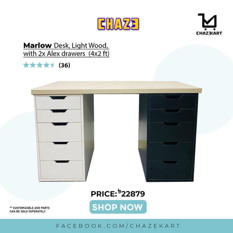 CHAZE MARLOW Table with 2x Drawers , Maple Wood/White/Black