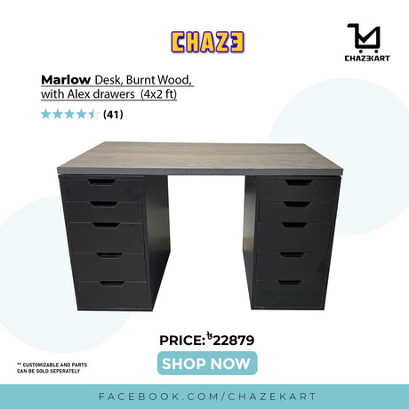 CHAZE MARLOW Table with 2x Drawers , Charcoal Burn Wood/Black
