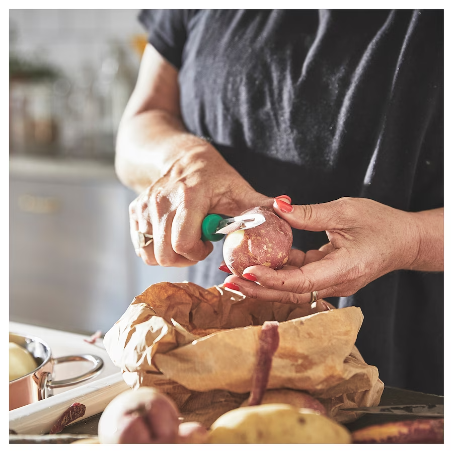 The UPPFYLLD potato peeler quickly peels the skin off vegetables such as potatoes, cucumbers, carrots, and squash. It features a sharp edge to remove blemishes or potato eyes. It is designed for easy hanging and storage as the handle has a hole in the top, or it can be stored in a kitchen drawer and easily found due to its colorful handle. The strong stainless steel blade ensures easy and efficient use and cleanup.