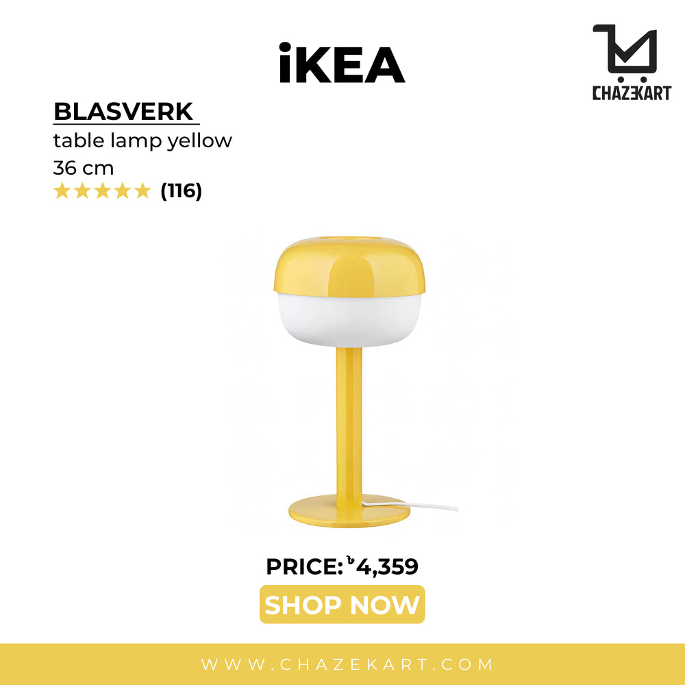 The BLASVERK table lamp provides a modern and warm ambient light with its soft yellow colour and retro design. It is 36 cm tall, making it ideal for any room in the home. Perfect for those on a budget, its low price makes this lamp a great value for money.