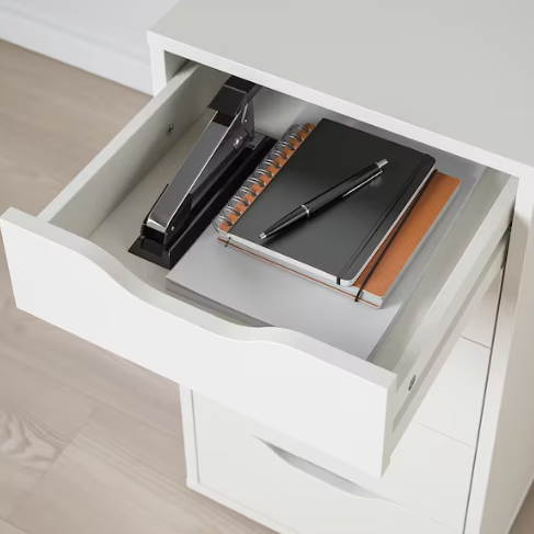 The CHAZE ALEX Drawer unit, in white and measuring 36x59x70 cm, features a versatile and sleek design that can complement various styles. Its finished back allows for placement in the center of a room, making it perfect for use as a standalone piece or as a desk supporting unit. This allows its beauty to be showcased from all sides.