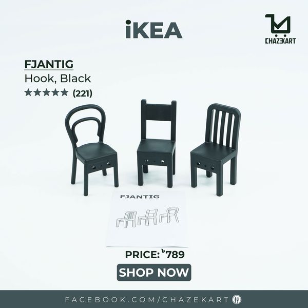 The FJANTIG Hook is a stylish and practical way to add a unique touch to any interior space. Made from black metal, this three-hook feature is designed to look like three miniature chairs, making it both functional and decorative. Add a playful eye-catching element to your home with this unique hook!