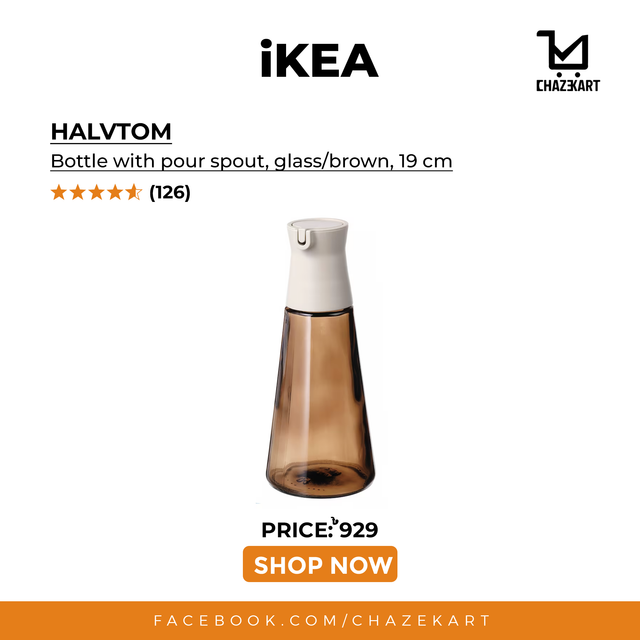 IKEA HALVTOM Bottle with pour spout, glass/brown, 19 cm is backordered and will ship as soon as it is back in stock.