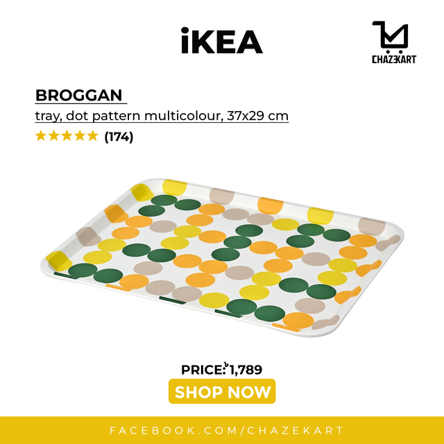 IKEA BROGGAN tray, dot pattern multicolour, 37x29 cm is backordered and will ship as soon as it is back in stock.