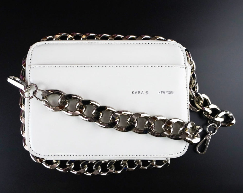 The white KARA Crossbody Bag showcases a printed logo on the front, along with a silver-tone chain shoulder strap for added style. With an all around zip fastening and internal slip pocket, this bag combines functionality with fashion. Inspired by the oversized bike locks worn by urban cyclists.