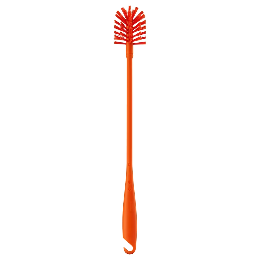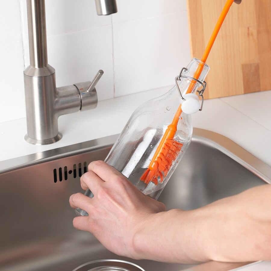 This orange brush makes it easier to reach and wash inside bottles and narrow jars. Hang it on a hook by the kitchen sink so you always have it close at hand. It's an ideal tool for maintaining cleanliness and hygiene around the home. The durable design and easy access make it a must-have item for any kitchen.