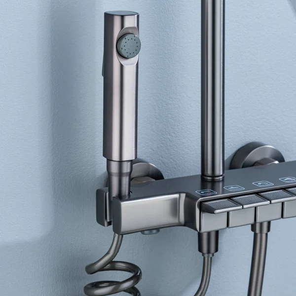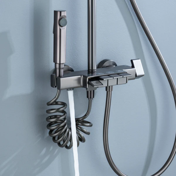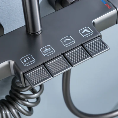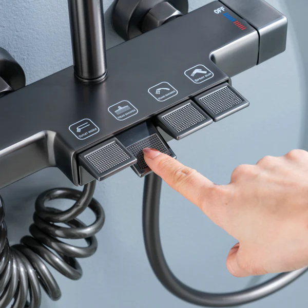 This shower system's body is made of solid brass and is designed to resist compression, prevent explosions, and withstand rust and corrosion. Its gun gray brushed process adds a touch of elegance while providing corrosion resistance and rust protection, as well as scratch and abrasion resistance. This versatile design complements various bathroom styles.