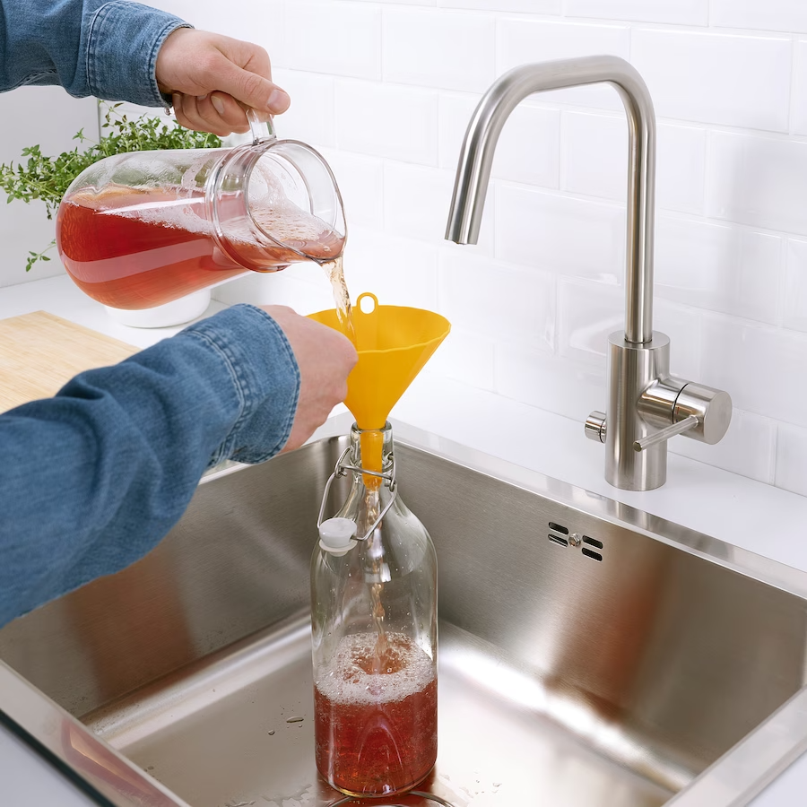 Uppfylld Funnel can be used with KORKEN bottles of all sizes. This versatile funnel ensures you can easily transfer liquids between bottles of all sizes, making it a great choice for a multitude of uses.