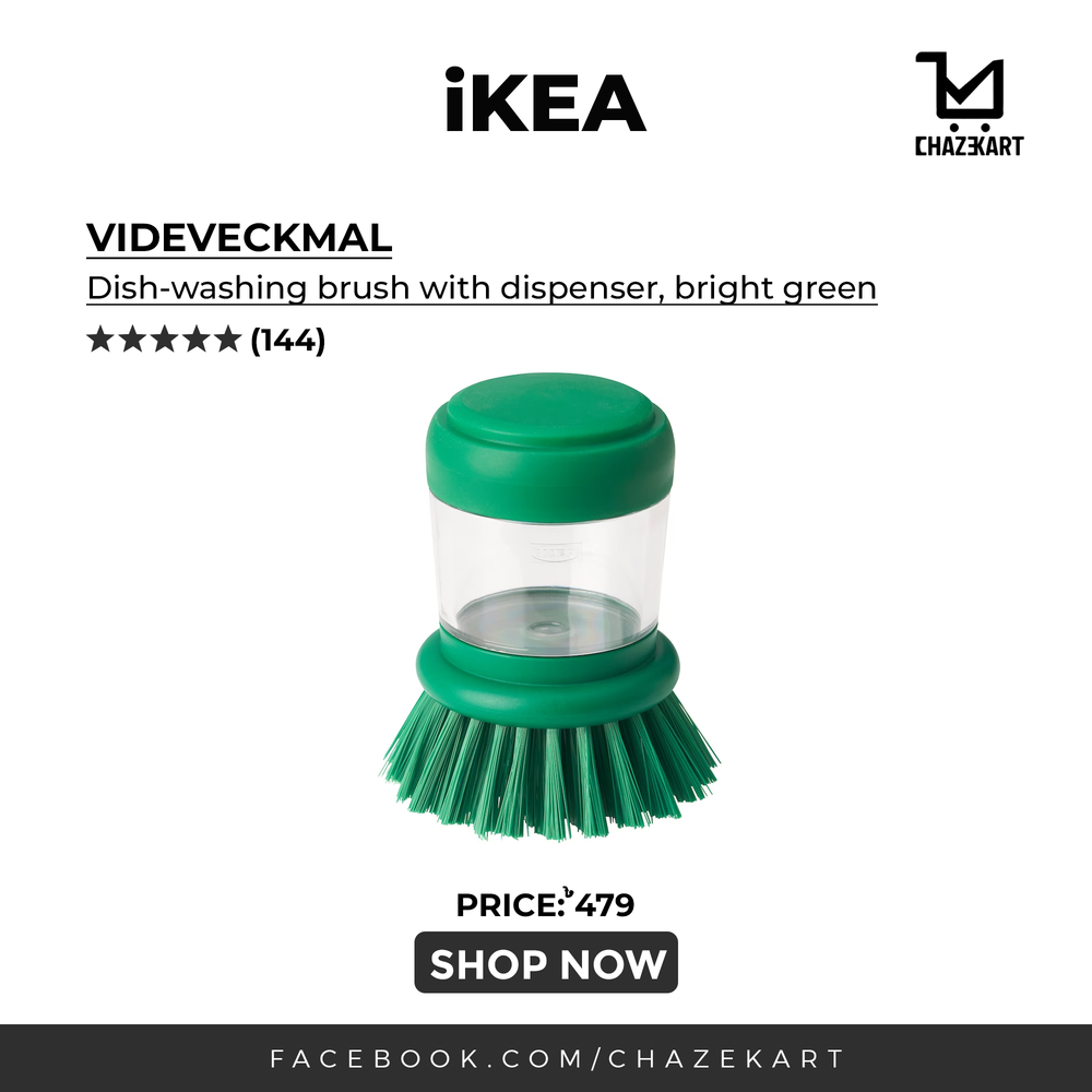 IKEA VIDEVECKMAL Dishwashing brush with dishwashing liquid dispenser, green is backordered and will ship as soon as it is back in stock.